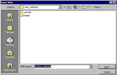generate the following screen: Click on "File" and then "Open Web" to open the web you have created on your desktop. The "Look in" field will then prompt you to browse to the web folder you have created on your computer. Select the web that you would like to publish and click on "Open" in the lower right hand corner of the screen. In our example below, the web is called "test_websites" .