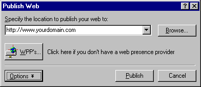 your web, simply click on "File" and "Publish Web". Once you click on "Publish Web" the following screen will be generated. Enter in the full URL of your website: http://www.yourdomain.com as FrontPage will find your remote Website account on our Dinsol web server using your domain name. Please make sure that your domain is either registered with or transferred to Dinsol's DNS records. Otherwise FrontPage will not be able to find your Dinsol account. You may check to see if your domain has Dinsol's DNS records registered by searching the following database for your domain name: http://www.nsiregistry.com/ Once you have entered your domain name in the field, all you need to do is click on "Publish".