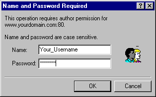 Why doesn't my new password work in my FrontPage® web? Loading and changing passwords in FrontPage is a little more complicated than with FTP programs. To set or change passwords, you'll need to log on to your current web in order for the security menu choice to be active. To change the user and password for FrontPage login: Go to the FrontPage menu: 1. Click: Tools->Permissions[Tools->Security in FP2000] 2. Add: Name, Password 3. Click "Administer, author and browse.." radio button 4. Click "Apply" and then "Ok". To change the password: Click: Tools->Change Password[Tools->Security->Change Password in FP2000] Type in old password, then new (if you've lost your old password, open a support ticket!). |