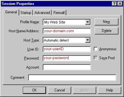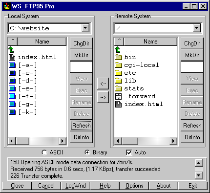 Configuring Your FTP Software • USERID Each time you run WS_FTP the Session Profile window will be displayed. A profile contains the information needed to connect to your web site. Creating a profile now will eliminate the need for you to configure the software each time you wish to connect to the web server via FTP. To create a new profile, click the "New" button and enter a generic profile name at the top of the Session Profile window. Next, enter the userid, password and hostname for your web site as illustrated below. Fig.1 Be sure to select "Auto detect" for the Host Type. (see Fig.1) It is best to select "Save Password" and "Auto Save Config" to maintain these settings for future use. All other fields can be left blank. You are now ready to connect to the web server. Click "Ok" to continue. How to Transfer Files Fig.2 You can transfer files directly to the root level and/or create subdirectories. The only system directory that you may need to use is cgi-bin or mainwebsite_cgi which is where you should upload your own custom CGI scripts. -------------------------------------------------------------------------------- Home PageUNIX: Our servers will look for a "home page" in the following order: index.html, index.htm, index.html Be sure to upload HTML documents and scripts in ASCII mode and images in BINARY mode. To transfer a file to a subdirectory, double-click the appropriate subdirectory to open it before transferring the desired file(s). As soon as a file is uploaded to the web server, it is available for all to see. If, after uploading a file, you are still unable to see the updated file via Netscape, you need to clear both disk and browser cache. This function can be found by selecting Options > Network Preferences in Netscape. Remember that you must first be connected to the internet through your local internet service provider in order to connect to the web server.