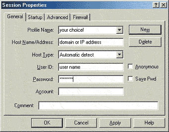 The following information is contained within your account activation notice and is needed to connect you to your website via FTP: Your User Name........(case sensitive) Using WS_FTP Each time you run WS_FTP the Session Profile