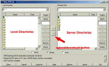 Double click on httpdocs to get to your web directory. This is where all your files will be downloaded, and/or you will create subdirectories. The one unique system directory that you may want to use is cgi-bin; this directory is reserved for custom Perl/CGI scripts. To make your home page load automatically, name the HTML document "index.html" in lowercase and upload it to the /httpdocs directory of your account. If you access your site (www.yourdomain.com) and see a page that says, "This is homepage ...." that means you have not uploaded your "index.html" file correctly. To upload a file or files, simply highlight the file(s) on the left and click the right arrow button (->) in the center of the window. Be sure to upload HTML documents and scripts in ASCII mode and images in Binary mode. To transfer a file to a subdirectory, double-click the appropriate subdirectory to open it before transferring the desired file(s). To create a new directory, click on the MkDir button when you are inside the httpdocs directory or subdirectory. As soon as a file is uploaded to the web