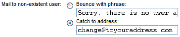 then you can disable your "catch all" feature. How can I force all unresolved email to bounce back with a specific message? |